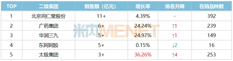 2024年Q1-Q3中成药TOP5集团大洗牌,广药集团和华润三九销售额增长率均超过20%,排名各上升1位,而太极集团则大涨36.26%,排名一口气跃升了4位。