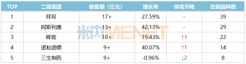 4家跨国药企继续牢牢守住领先地位,拜耳以17.5亿元的销售额稳坐TOP1集团宝座,晖致、诺和诺德各上升1位,而本土企业三生制药排在TOP5。
