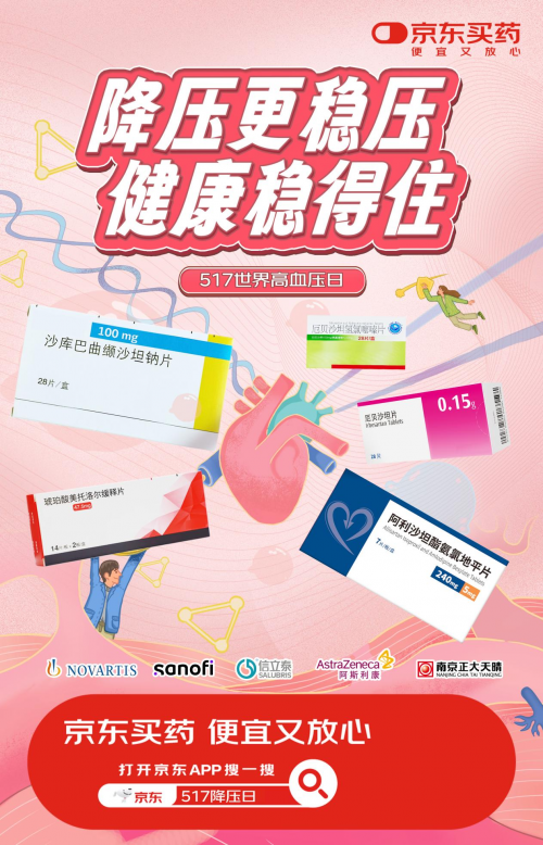 值此第21个世界高血压日来临之际,京东买药携手诺华制药、赛诺菲、阿斯利康、深圳信立泰药业股份有限公司、南京正大天晴制药有限公司等多家国内外知名药企,共同发起“降压更稳压,健康稳得住”主题系列活动,旨在通过防治结合,助力公众科学管理血压。