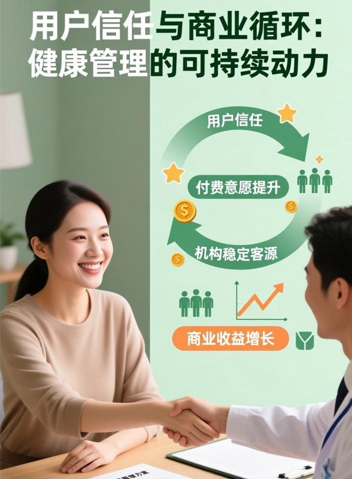 这种全链条服务体系带来的好处是多方面的。首先,用户能够切实感受到健康管理的长期价值。通过个性化的方案和持续的跟踪服务,他们看到自己的身体状况逐渐改善,健康问题得到有效解决,从而对健康管理服务产生高度认可和信任,进而提高付费意愿和忠诚度,为健康管理机构带来稳定的客户资源和商业收益,形成稳定的商业循环。