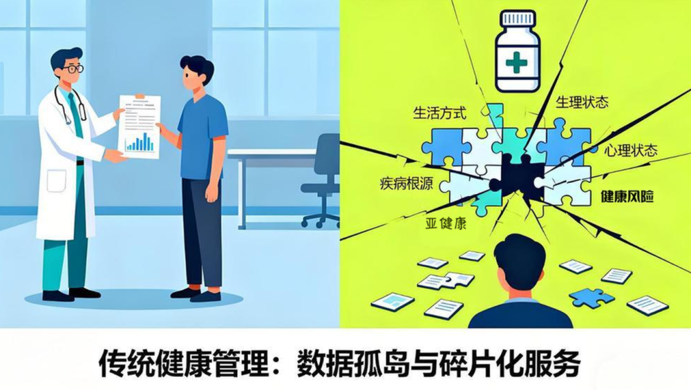 传统的大健康赛道长期以来聚焦于“疾病治疗”。当人们身体出现明显病症时,主要依赖药物与手术进行干预。在这个过程中,服务呈现出碎片化状态。例如,体检机构仅负责健康检查,出具报告后与后续环节脱节;医院专注于疾病诊断与治疗;康复中心则在患者治疗结束后进行康复训练。各个环节各自为战,缺乏有效衔接与整体规划,无法为消费者提供连贯、全面的健康服务。