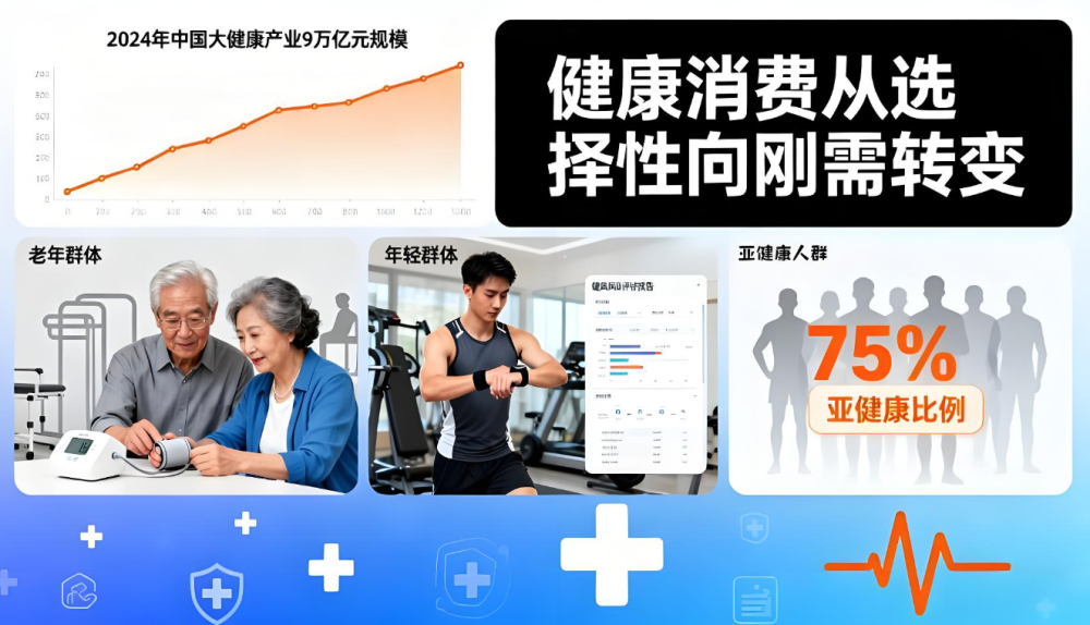 随着生活水平的提高,人们健康意识不断增强,健康消费需求正从“选择性消费”向“健康刚需”转变。中国消费者协会发布的报告显示,2024年中国大健康产业总收入规模达到9万亿元,且仍在持续增长。在老龄化加剧的背景下,老年群体对健康管理、康复护理等需求大增;同时,年轻一代也更加注重生活品质与健康预防,对个性化的健康服务如健康风险评估、科学运动指导等兴趣浓厚。此外,亚健康人群规模庞大,据世界卫生组织调查,全球约75%的人处于亚健康状态,这一群体对改善健康状况的需求急切,为新赛道的健康管理服务提供了广阔的市场空间。
