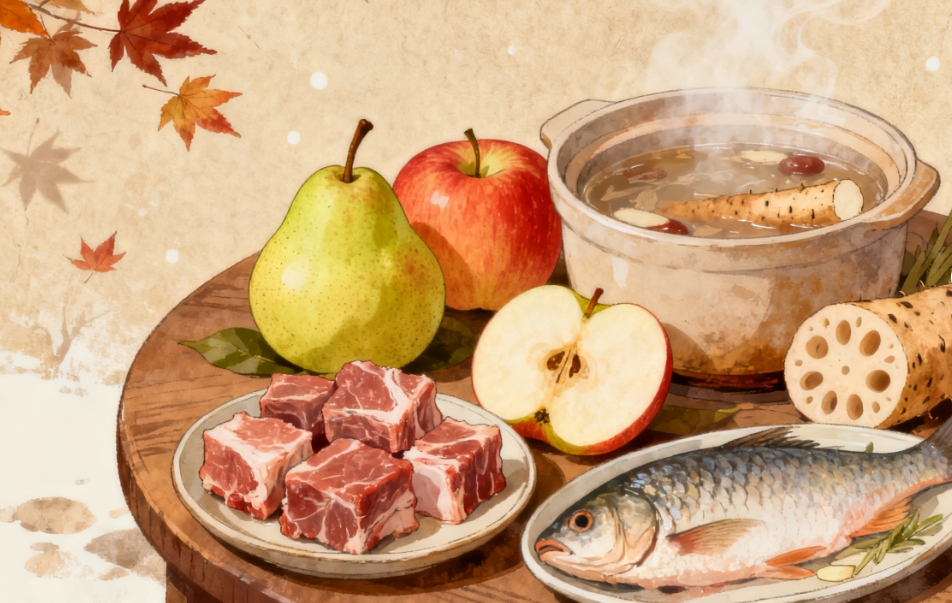 霜降是秋天的尾巴,每到这个时候,我们往往会感到更加干燥,很多人会出现口干、唇干、鼻干、咽干、皮肤干燥、大便干结等问题。这些都是因为燥邪耗伤津液导致的,所以建议以温润食材为主,兼顾防燥与御寒,如梨、苹果、山药、莲藕等润燥蔬果,搭配羊肉、鱼肉等优质蛋白。减少寒性食物(如西瓜、苦瓜)和辛辣刺激物摄入,以防损伤脾胃。