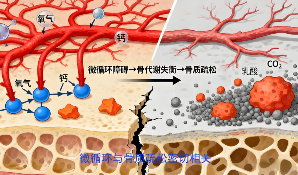 很多人可能不了解,微循环与骨质疏松症之间存在着极为密切的关联。微循环作为人体循环系统的重要组成部分,主要通过影响骨组织的供血质量、营养物质输送效率以及代谢废物排出速度深度参与骨代谢的调控过程。当微循环出现障碍时,骨组织无法获得充足的氧气和营养供给,同时代谢废物堆积,会直接导致骨细胞活性失衡——成骨细胞功能减弱,破骨细胞活性增强,进而加速骨量流失,最终诱发或加重骨质疏松症。这一机制也为治疗骨质疏松症提供了全新的研究方向和治疗思路。