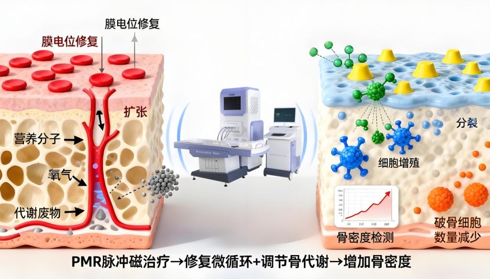 PMR脉冲磁微循环治疗为骨质疏松症的物理干预带来了突破性进展。脉冲磁微循环治疗通过调节血红细胞膜电位,修复微循环,增强骨组织供血、营养输送及代谢废物排出能力;刺激骨组织多种细胞生长因子,参与骨代谢的重建偶联过程,介导骨质疏松的发生和发展,减少和防止骨量丢失,增加骨密度。在刺激成骨细胞增殖的同时,PMR电磁场不仅可诱导成骨细胞释放胰岛素样生长因子II,而且增加成骨细胞上胰岛素样生长因子II的受体数目,两者共同作用,促进细胞增殖。