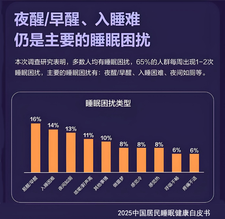《2025中国居民睡眠健康白皮书》显示:我国居民整体睡眠状况不容乐观,超过65%的受访者长期存在睡眠困扰,夜间睡眠时长普遍偏短,总体睡眠质量欠佳。
